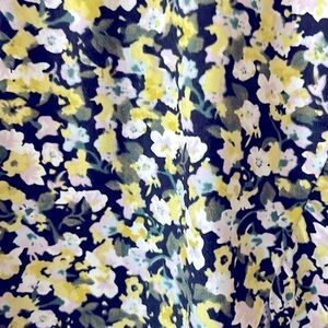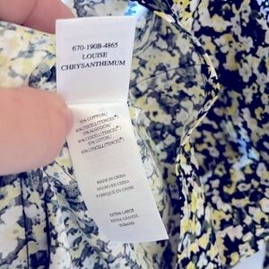 New with tags. XL dress. Pull over styling. 3/4 elastic sleeves. Interesting diagonal seams and tie back add nice details. Beautiful print on Black fabric with small, almost abstract yellow and white flowers with taupe and pale blue details. Very soft fabric 55% cotton/ 45%