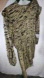 Ultra lightweight, hammered satin, long sleeve, partially lined, golden brown dress featuring black tiger inspired design throughout, straight fit, crew neckline, ruffle detail at shoulders, elastic waist with concealed adjustable drawstring, lined skirt, elastic cuffs, and keyhole opening at back neck with button closure. A pullover style dress with elastic waistline and romantic details make for easy wearability with a feminine touch.