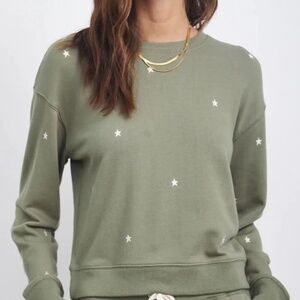 This cozy, lounge worthy pullover style is perfect for relaxing at home or going about your day in the most comfortable fashion. Made from lounge terry this long sleeve olive crew neck sweatshirt features soft white embroidered stars throughout the body, dropped shoulders, and tall rib trim at cuffs and hem.