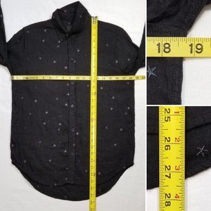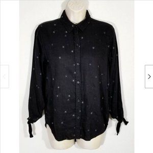 Gently used, no holes, tears or stains. Few tiny snags in different locations due to the linen blend material: near last button, right front hem, right shoulder, back of left sleeve, and back hem. See all photos.