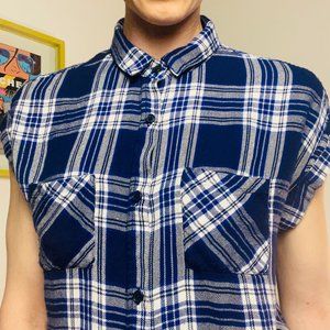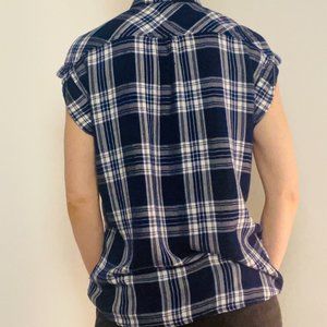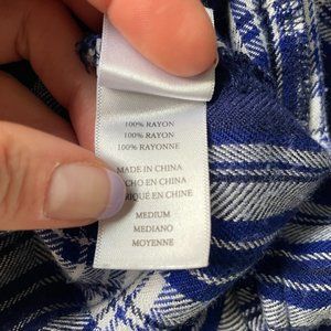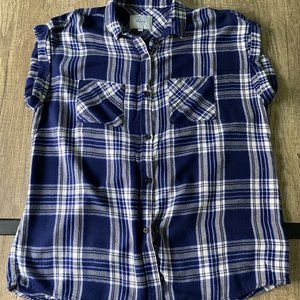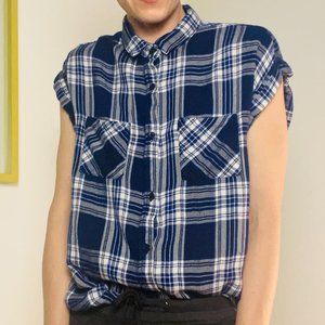 Blue plaid is timeless. The folded sleeves mimic a muscle tee style but the from of the shirt mimics a classic flannel. The material is soft and warm (great for layering - 100% rayon) and the size is Medium. Condition: great! The length is a bit long but can easily be tucked for a cute, oversized feel - as it has a boxy fit. The great part about this top is it is not limited by shoulder seam via its size like others rails tops. It's more forgiving.