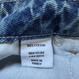 Faded, whiskered, distressed detailing throughout, ripped knee
