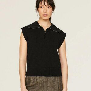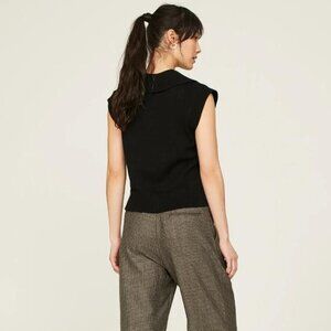 Black knit. Vest. Cap sleeves. Mock neck. Front zipper closure.