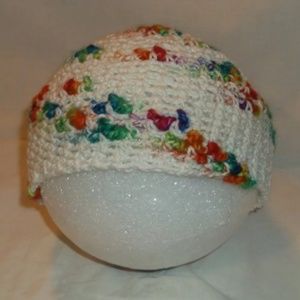 This is a beautiful handmade crocheted RAINBOW BABY beanie hat. The hat is crocheted with a white yarn that has accents of varigated rainbow colored nubby yarn. This hat is suitable for a girl or boy. It is an ooak (one-of-a-kind) hat designed and created by me.
