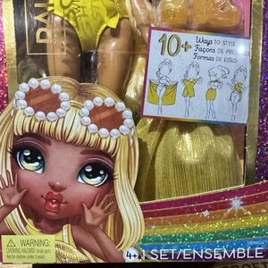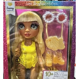 The Rainbow High Swim & Style Sunny Madison 11" doll is a fashion doll from the Rainbow High franchise. This doll features blonde straight hair, blue eyes, a medium dark complexion, and comes in her original packaging. She is a part of the Rainbow High product line and is suitable for ages 4 and up. This doll, Sunny Madison, is a girl doll made of plastic and is ideal for all occasions.
