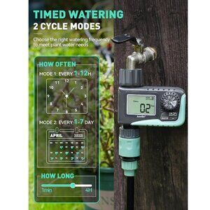 RAINPOINT Sprinkler Timer, Programmable Water Timer for Garden Hose, Outdoor Soaker Hose Timer with Rain Delay/Manual/Automatic Watering System, Digital Irrigation Timer for Yard, Lawn, 1 Outlet The Sprinkler Timer is a user-friendly device that allows you to set various watering times, including start time, duration, and frequency. It also offers rain delay and manual mode, allowing you to pause your schedule for specific periods and resume it automatically. The timer features a large LCD screen, providing detailed information on watering time, frequency, and power. It is a multi-scene hose timer suitable for various settings, including gardens and yards. The product comes with a water timer and user manual, powered by 2AA alkaline batteries. The user manual helps you set the timer and displays power on the screen.