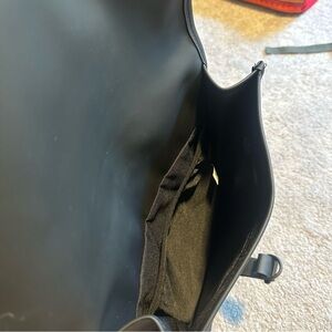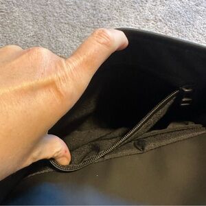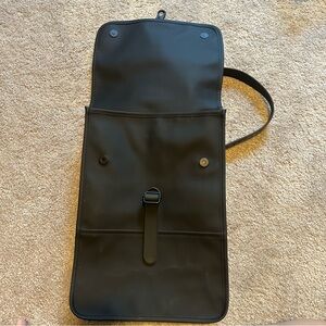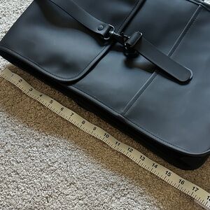 This sleek black RAINS waterproof backpack is perfect for everyday use. Its modern design and durable material make it a must-have accessory. Laptop sleeve area inside.