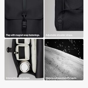 Backpack is cut from Rains' signature PU fabric, engineered for carrying strength, durability and a smooth feel.