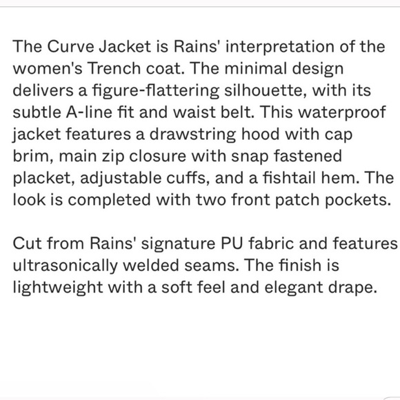 This waterproof jacket is cut from Rains’ signature PU fabric and features ultrasonically welded seams. The finish is lightweight with a soft feel and elegant drape.