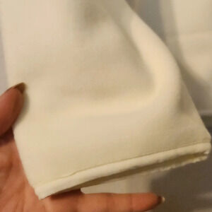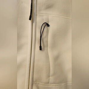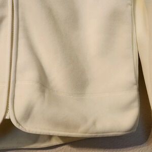 Pale yellow, extremely soft collar less jacket. 2 side pockets and 1 zip pocket. Oversized, will fit up to medium.