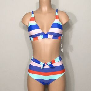 Raisins high waisted multi colored stripe swimsuit with triangle top. Fully lined. Soft removable cups. Ties at the back.
