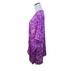 The RAJ Kimono is a knee-length geometric print kimono featuring a V-neckline and half kimono sleeves, perfect for travel, parties, or casual occasions. Made of polyester chiffon, this one-size top is lightweight and easy to care for with a dry clean only. Handmade in India, this bohemian-inspired kaftan from the brand Raj is ideal for summer, fall, and spring seasons, offering a colorful and retro vibe that is sure to stand out.