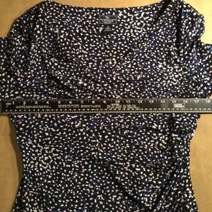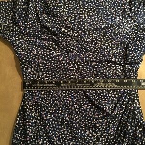 Pullover; 95% Polyester, 5% elastane (has plenty of STRETCH); lined; empire waist; faux wrap styling, ruched on left side from bust through hip; gathered shoulders; 3/4 sleeves; knee length; ALL season; GORGEOUS White/Purple/Royal Blue CONFETTI print on a BLACK background!