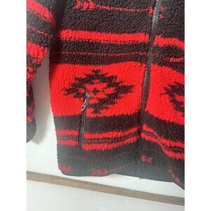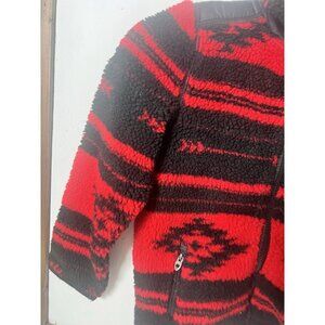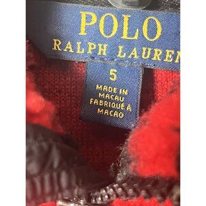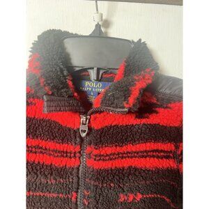 The product is a Ralph Lauren Aztec print fleece jacket for kids in size 5. This jacket features a western cowboy theme with a colorful Aztec design, perfect for boys who love bold patterns. Made from cozy fleece material, this basic jacket by Polo Ralph Lauren is both stylish and comfortable for young boys to wear. The vibrant red color adds a pop of personality to any outfit, making it a great addition to any little boy's wardrobe.