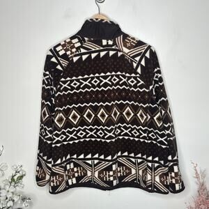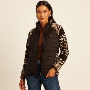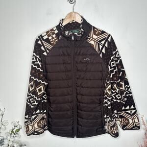 Lauren Ralph Lauren Active Brown Fleece Jacket. Brown Puffer Vest Style Center with Fleece Sleeves. Geometric Aztec Pattern. Super Comfortable + Warm. Perfect for Fall & Winter, Medium Weight Jacket.