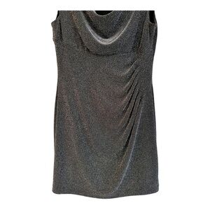 RALPH LAUREN, BLACK, RUCHED, SHIMMERY METALLIC, SLEEVELESS, STRETCHY FITTED DRESS. DRAPED NECKLINE WITH RUCHING AT FRONT SIDE. SLIP-ON. NO ZIPPER. FULLY LINED. LIKE NEW. SIZE 14