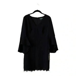 RALPH LAUREN Black Knee Length Sheath Dress Bell Sleeve V-neck Lace Hem Formal 4P