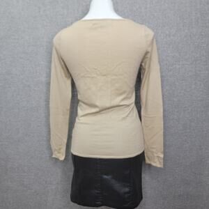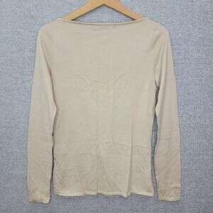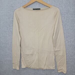 Camel color long sleeve boat neck knit top made of cashmere and silk. Size M, pre-owned in great used condition. Sleeve shows a faint stain on the right sleeve. I will try to remove before shipping but not sure if it will come off.