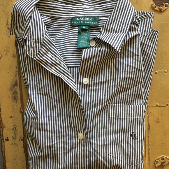 LAUREN RALPH LAUREN SLATE GRAY WHITE STRIPED SHIRT LONG SLEEVE BUTTON UP CAREER TOP 100% COTTON M