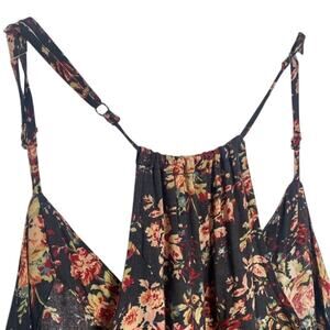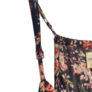 Charcoal base with pink, terracotta, red, sage and blue floral print. One piece racer back, thin adjustable straps, drawstring waist, elastic jogger hem and functional 5 button front bodice. 2 side pockets v-neckline. Machine wash cold.