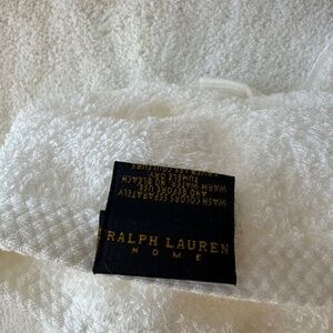 Wide basket-woven tonal stripe at each end with "Ralph Lauren" tag. Bath mat has double tonal stripes.