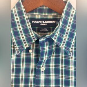 RALPH LAUREN GOLF Tilden Mens Button Down Shirt Blue Green Plaid Crest Large