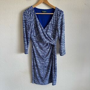 RALPH LAUREN Green Label Blue Surplice Neckline 3/4 Sleeve Midi Dress Womens 6