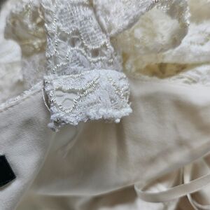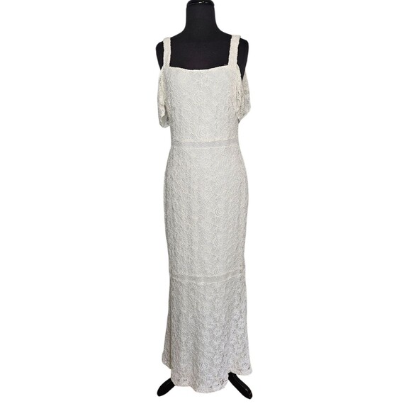 RALPH LAUREN LRL White Lace Maxi Dress. Size 8. Wide straps with off the shoulder ruffles. Elegant. Bridal. Lined. Back zipper closure. PLEASE NOTE: Straps appear to have been adjusted (see photos 6, 7 and 8). Also, there is discoloration at the top of the right strap (photo 5). Missing material tag.