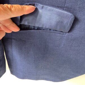 100% linen. Fully lined. Faux flap pockets on front. Notch collar. Functional interior pockets. No vent in rear. Dry clean.