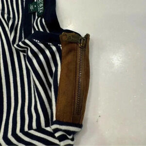 The top is in perfect condition. Blue & white stripe with suede patches on the elbows. Shoulder zip with suede accent. See photos for measurements