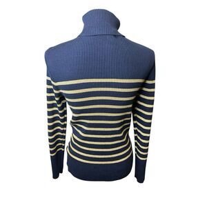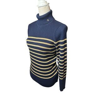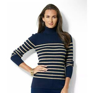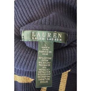 RALPH LAUREN Navy Blue Gold Metallic Stripe Cotton Blend Logo Ribbed Sweater L