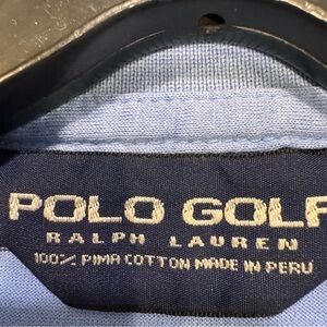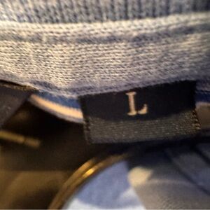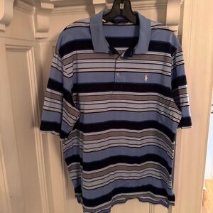 Excellent like new condition. Men’s Polo Golf short sleeve polo shirt. Blue, white & gray stripes. Size L. See photos for measurements.