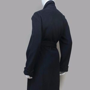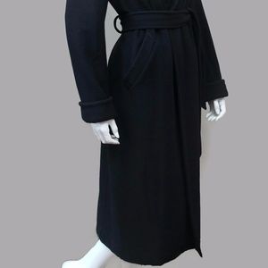 SUPPLE, 100% cashmere wrap, in a deep shade of navy blue ~ Three pockets ~ turned sleeve cuffs ~ wrap sash ~ intact lining