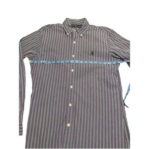 This Ralph Lauren men's small button-up long sleeve polo shirt features a classic striped pattern with the signature pony logo embroidered on the chest. Made from cotton with a woven fabric type, this button-down shirt is suitable for various occasions such as travel, casual outings, and business settings. The shirt has a collared neckline and a 45-inch chest size, making it a tailored fit for a stylish and comfortable look. With easy care instructions and suitable for all seasons, this Ralph Lauren Polo shirt is a versatile addition to any man's wardrobe.
