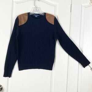 RALPH LAUREN Sweater Women L Navy Cashmere Ribbed Brown Faux?Leather-Elbow-Patch