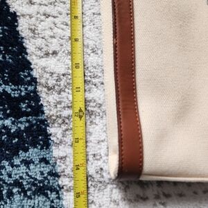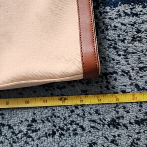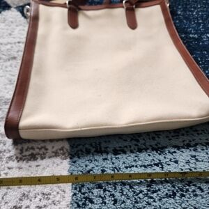 RALPH LAUREN Vintage Cream Canvas and Leather Two Way Tote Satchel Bag has inner zipped pocket, open wall pocket, silver tone hardware, zip top closure detachable adjustable canvas straps, double flat top Leather handles Bag is in excellent condition, measures 15 x 14 x 2 inches. handle drop is about 5 to 8 inches.