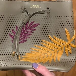 NWOT Lauren Ralph Lauren crossbody bucket bag. 100% cow leather with authentication card and gray-green color. Colorful botanical leaf detail and perforated hole detail throughout. Adjustable strap and bucket bag like drawstring around the body of the bag. No callouts.