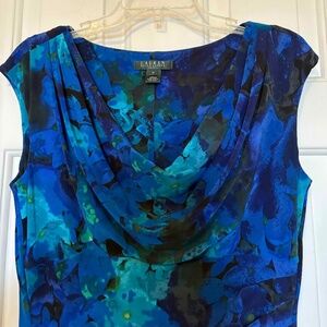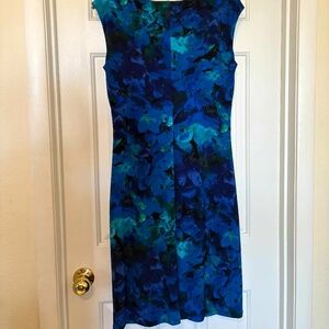 RALPH LAUREN knit jersey watercolor print dress, size 10. Worn once. Fabulous soft stretch fabric flatters every body shape. In a dark blue & black watercolor print with a soft drapey neckline. Comes to a little below knee length depending on your height. Measures 39” from shoulder to hem, 19" pit to pit. Fully lined. This dress is GORGEOUS. From a smoke-free home.