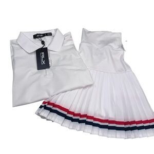 BRAND NEW with tags. Women’s 2 pcs tennis / golf outfit. Ralph Lauren RLX white sleeveless top with snap close & Beach Riot skort, white pleated with red & navy stipe accent. The short have tennis ball pockets. Both size medium. MSRP $196.50