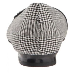 Textile upper features a plaid print. - Slip-on construction. - Soft, pointed toe. - Decorative strap and brand logo detail at vamp. - Soft leather lining. - Lightly padded footbed for added comfort. - Heel Height: Approx 1⁄2 in - Black/White plaid