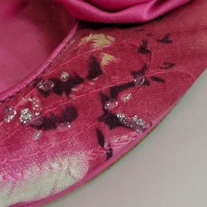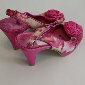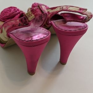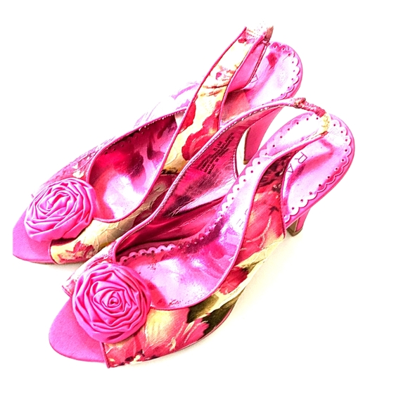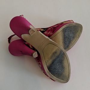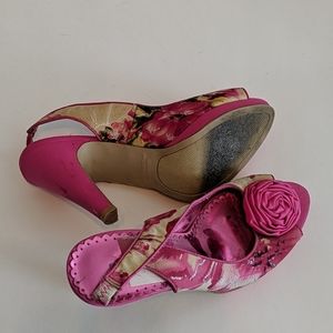 MSRP $89.00 RAMPAGE ROSETTE HEELS PRELOVED ❤️ PINK FLORAL METALLIC SILVER PLATFORM HEELS 8.5 3/4" PLATFORM 4" HEEL S381