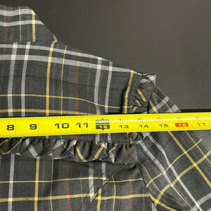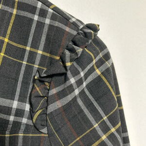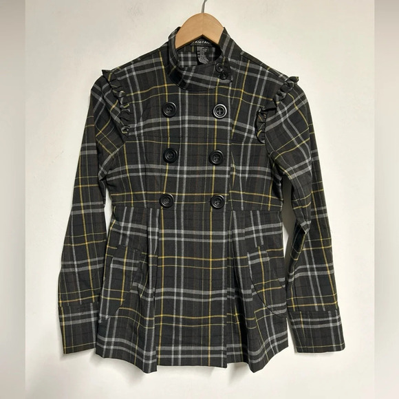 This ,double breasted, plaid, button, lightweight jacket, with ruffle accent around the sleeves ,shoulders two pocket