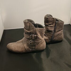 RAMPAGE RAM-BAYVIEW DOUBLE CRISS-CROSS STRAP SLIP-ON BOOTS SIZE 7M COLOR GRAY Designed with faux suede upper with oil finish, round toe, gathered shaft, low heel, pull on tab and ankle straps with adjustable buckles. Sole Padding Synthetic non-skid sole cushioned foot bed with padded insole COMFORTABLE AND SECURE FIT: With the perfect amount of padding, you'll be able to run around all day with ease in comfort! The construction is designed to give you a secure yet comfortable fit based on the size you choose. Please kindly refer to the size chart prior to selecting. QUALITY AND VALUE Why spend more on high end seasonal, year-round, occasion styles when you get the same designer quality at discounted and competitive prices? This style can be for just about any outfit with designs to help accentuate your legs and highlight your creative and fashionable look! The treaded outsole will make sure you go about your day and night safely and without fatigue. THIS ITEMS IS PRE-OWNED EXCELLENT CONDITION WITH ONLY LIGHT SIGNS OF WEAR IF ANY CHECK THE PICTURES