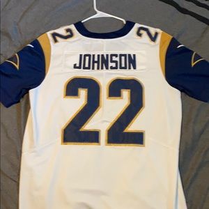 Trumane Johnson #22 Rams jersey. stitching needs a little work, overall 7.5/10 wore it twice. being on hangar caused stitching to peel on shoulders. should be an easy fix.