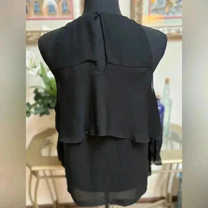 This black blouse features a unique cold-shoulder design with ruffled layers and flowy tied sleeves, creating a trendy and feminine look. Retailed for $325.00 New with tags! Classic, sophisticated, chic, modern look . Elevate your wardrobe with this beautiful piece ! 100% silk❣️