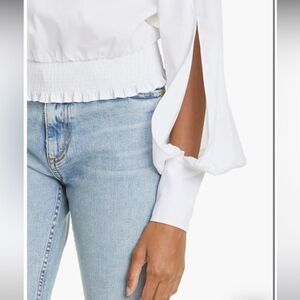 A stretch-cotton top saves the statement-making for the sleeves, which include both a billowy balloon silhouette and a slashed slit.