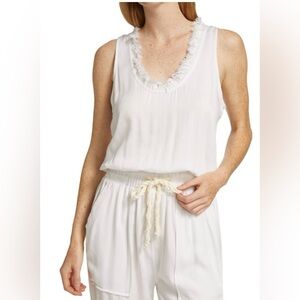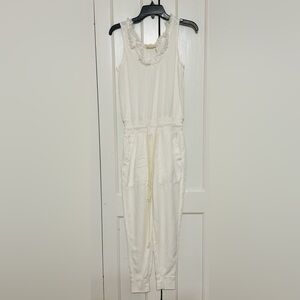 Jumpsuit styled with frayed neckline, drawstring waist, and banded cuffs.