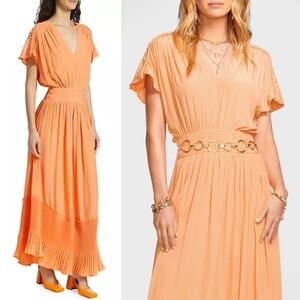 Ramy Brook's Cymone dress in Peach flaunts an elasticized waist and a pleated hem. This flowy style is finished with braided accents at the shoulders.