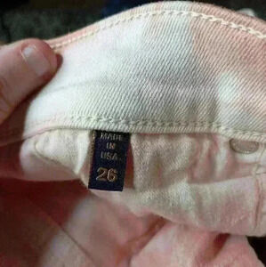 Very cute peach color tie dye pattern denim jeans. Has two buttons on the front and belt loops for a cute belt. Even has a big long zipper on the bottom of the jeans.Ankle cropped.One of a kind jeans! Match with anything.