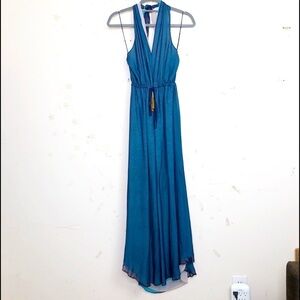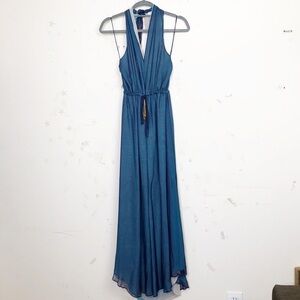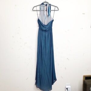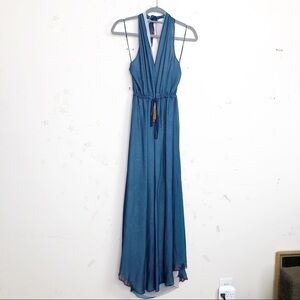 Ramy Brook Daphne Silk layered halter back ties around the neck with gold toned tassels and split at the front, Maxie dress, 100% silk with blue teal and gray layers and drawstring waist.